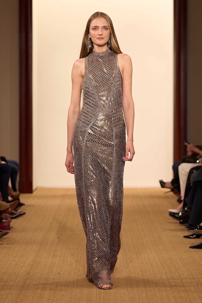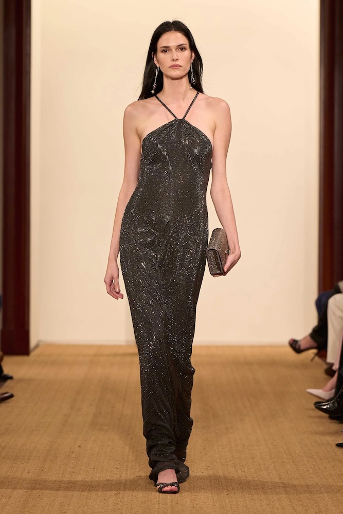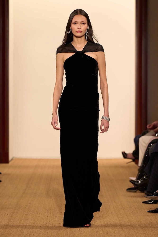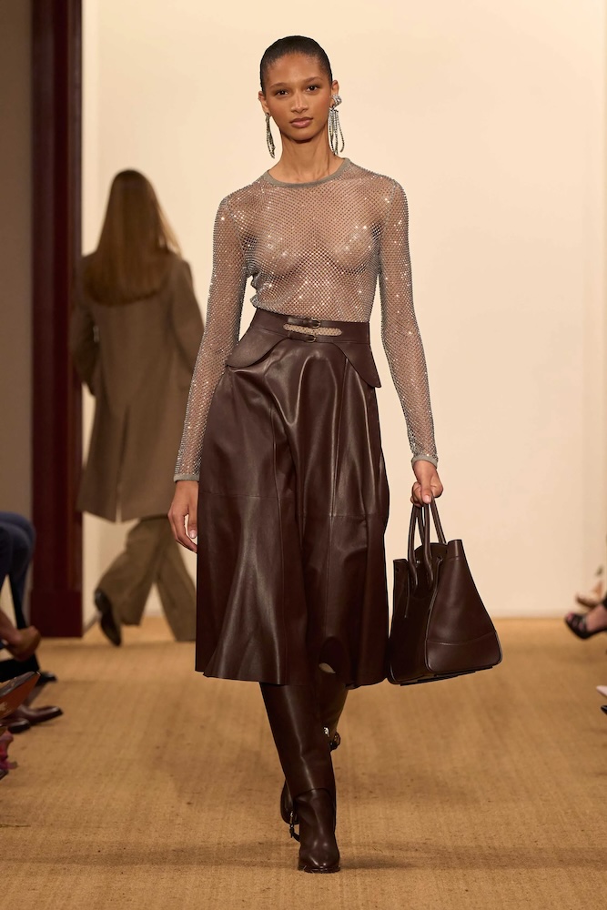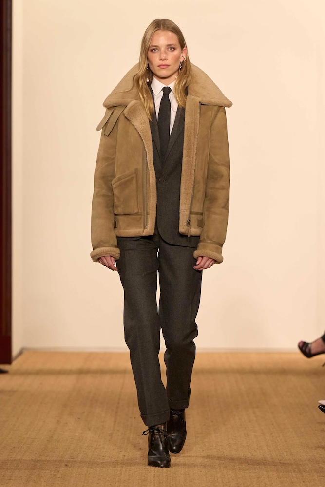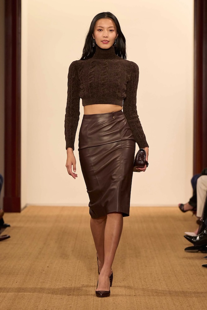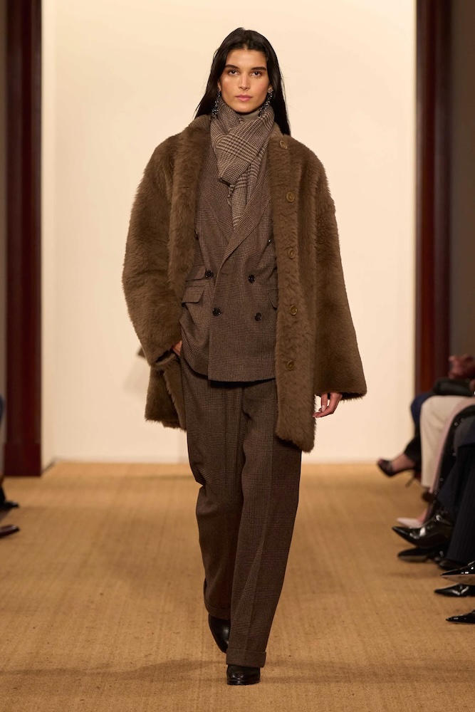 45 farklı görünümün yer aldığı defilenin renk skalasında bejin yanı sıra, karamel, sütlü kahverengi, maun, metalik ve siyah bulunuyor. Yün, ipek krep, süet, kaşmir kumaşlara klasik Ralph Lauren şıklığını vurgulayan tokalı kemerler, devasa kovboy şapkalar ve zamansız çantalar eşlik ediyor. Işıltılı ve boyundan bağlamalı elbise, kruvaze siyah smokin, deri kalem etek, Irına Shayk’ın taşıdığı maun rengi süet tulum, safari ceket, yün pantolon tasarımları ve püskül detaylarıyla Ralph Lauren zamansızlığını zarafetle harmanlıyor.