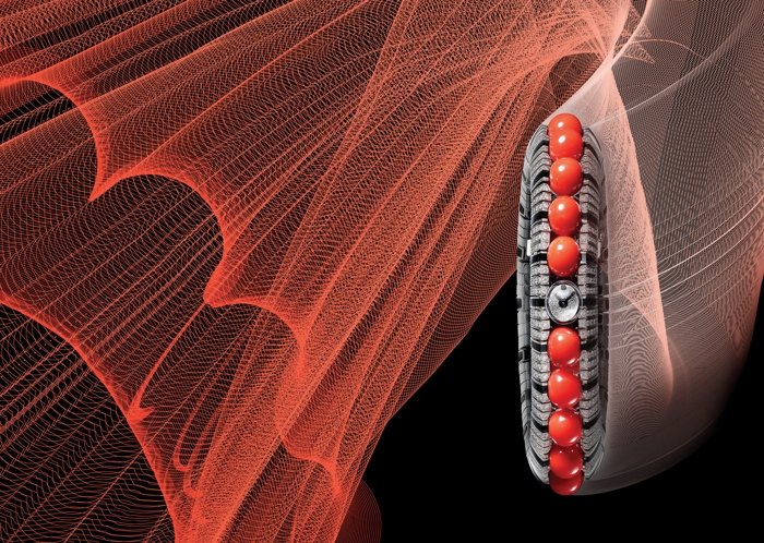 Kolye, bilezik ve küpelerden oluşan Kanaga seti ise Batı Afrika'da yaşayan Dogo halkının geleneksel tören giysilerini hatırlatan detaylara sahip. Başrolde bu kez spinel ve pırlanta var. Cartier, dünyayı gezerken denizleri de unutmamış. Güney Denizi'nin istridyesi ile bazı bölgelerde dansçıların ayak bileklerine taktıkları deniz kabuğu ve zillerden oluşan halhallardan ilham alan Orienphonie saat bilezik, kendisini tamamlayan yüzük ve küpeler ile doğanın dengeli asimetrisini mükemmel bir estetikle yansıtıyor. Üzerinde mercan, pırlanta ve oniks taşıyan saatin kadranı, 'sunum hareketi' olarak avuç içi yukarıya çevrildiğinde kendini gösteriyor.