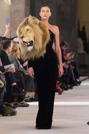 Paris Couture Haftası'nın 2023 İlkbahar sezonu, dün Schiaparelli'den Daniel Roseberry'nin omuzdan ve göğüsten fışkıran ürkütücü, hiper-gerçekçi hayvan kafalarıyla monte edilmiş bir dizi kıyafeti piyasaya sürmesiyle gümbürtüyle açıldı. Irina Shayk defileyi açmak için böyle bir elbise giymişti ve Kylie Jenner aynı görünümde ön sırada oturuyordu. Bazı açılardan, Jenner tam anlamıyla bir aslanla birlikte oturuyor gibi görünüyor, yelesi onun kontürlü yanaklarına sürtünüyor.
