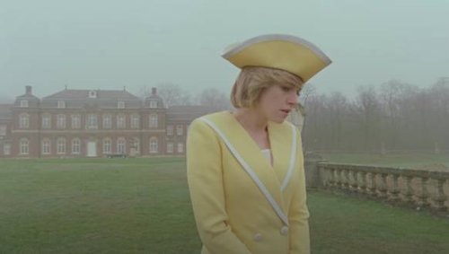 Fragmanın belirli bir sahnesinde, Stewart, kanarya sarısı bir takım elbise ve ona uygun bir şapka giyen puslu bir bahçeye bakıyor, Diana'nın giydiği takım elbiselere son derece benzer.