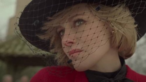Özellikle net bir görünüm olan fileli bir peçe, siyah şapka ve kırmızı takım elbise aktrisin özelliklerini taşıyor. Kıyafet, filmin merkezinde olduğu belirli bir günde Prenses Diana'nın giydiği kıyafete oldukça benziyor; Charles'tan ayrılmaya karar verdiği gün.