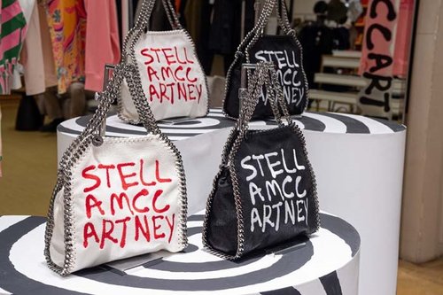Ed Curtis'in sprey boyalı Stella logosu, mini ve maksi ikonik Falabella çantalara, Alter Mat vegan logolu çanta ve cüzdanlara, kürk kullanılmayan tote çantalara yeni yorum katıyor.