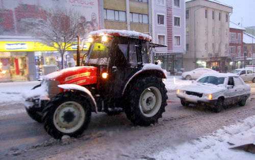 BOLU'DA ETKİSİNİ ARTTIRAN KAR YAĞIŞI NEDENİYLE ŞEHİR MERKEZİNDE YOLDA KALAN ARAÇLAR, TRAKTÖRLERLE ÇEKİLDİ