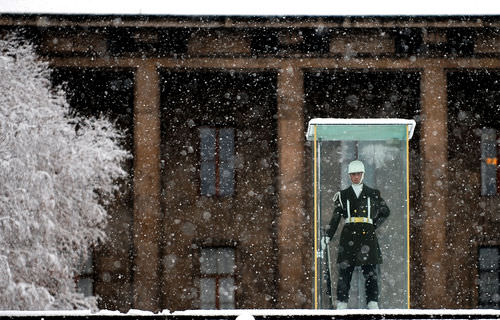 ANKARA'DA SABAH SAATLERINDE BASLAYAN KAR YAGISI SURUYOR. TBMM GIRISINDE KAR YAGISI ALTINDA NOBET TUTAN ASKER BOYLE GORUNTULENDI.
