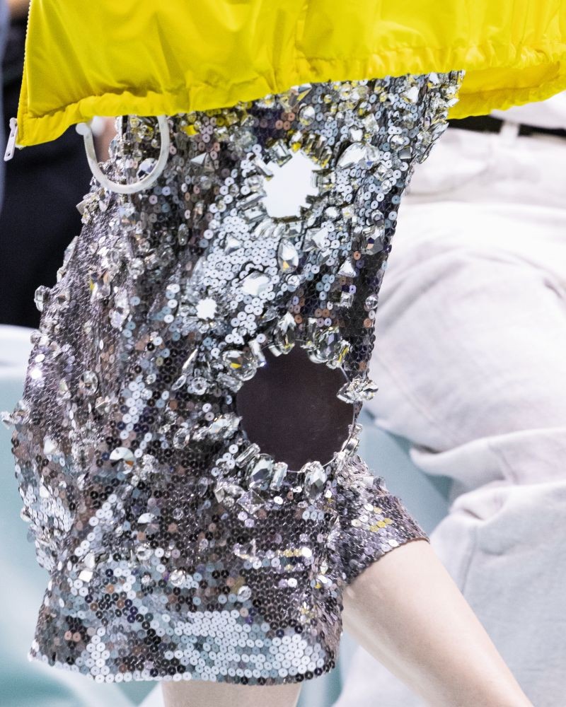 Prada, 2025 İlkbahar/Yaz koleksiyonunu Milano Fondazione Prada’daki Deposito’da gerçekleştirmişti. Farklı ruh hallerini kreatif silüetlerle yorumlamış ve ortaya oldukça iddialı bir koleksiyon çıkmıştı. Miuccia Prada ve Raf Simons, kovboy görünümlerinden bir anda fütüristik çizgilere kayan zengin bir seri yaratmıştı çünkü. Klasik baklava desenlerinden kovboy detaylarına, formel görünümlerden fütüristik silüetlere yelpazenin geniş tutulduğu bu koleksiyonda öne çıkan bir parça vardı: El işçiliğiyle yaratılmış parlak gümüş pullu, aynalı ve üç boyutlu kesimli taşlarla süslenmiş tül elbise. Bu tasarım, ustalığın ve detaylara verilen önemin nasıl büyüleyici bir görsel şölene dönüşebileceğini kanıtlıyordu.