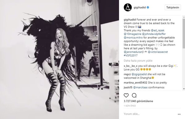 Ancak Gigi Hadid önümüzdeki günlerde gerçekleşecek olan Victoria's Secret defilesinde yer almayacağını açıkladı. Yaklaşık iki senedir Victoria's Secret podyumunda boy gösteren Gigi Hadid Twitter hesabından bu yılki defileye katılamayacağını açıkladı.