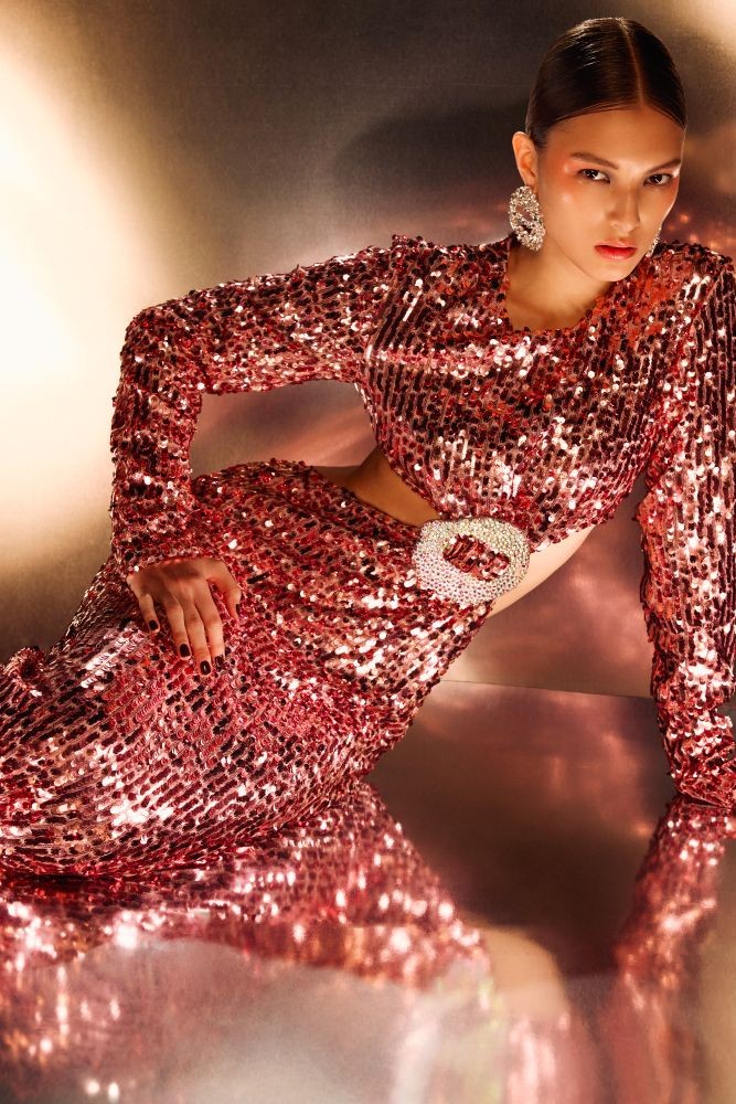 Koleksiyonun tasarım dili, ışıltının mimarisini yeniden tanımlıyor. Yoğun payet işlemeleri, üç boyutlu pullar ve Swarovski taşlarla işlenmiş deniz kabuğu motifleri, modern kadının zarafetini zırh gibi taşıyor. Metalik gümüşler, buzlu lavanta ve likit bordo tonlarıyla bezeli bu koleksiyon, aşkın artık bir duygu değil; duygunun kontrolü olduğunu vurguluyor.