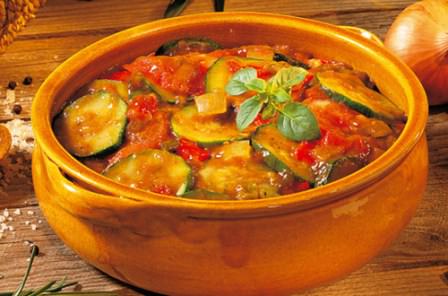 Yağı kızdırın. Soğanı ilave edip, sebzeleri içine koyun ve karıştırın. Domatesi, tuzu ve şekeri koyup, 5 dakika karıştırın. Sebzeleri ekleyin.Üzerini kapatacak kadar sıcak su koyup kaynatın. Ağır ateşte 25 dakika pişirin. Soğuduktan sonra, maydanoz ile süsleyerek servis yapın.