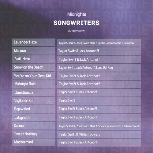 Kravitz, "Lavender Haze" ve "Karma" şarkılarında ortak yazar olarak yer alıyor. Joe Alwyn ise William Bowery takma adı altında "Sweet Nothing" şarkısını Taylor Swift ile birlikte yazdı. Alwyn daha önce Swift ile 2020 albümleri Folklore ve Evermore için aynı takma adla şarkılar yazmıştı.